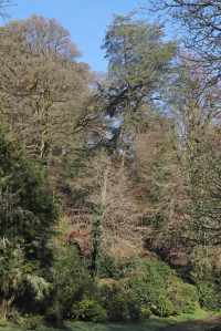 In the first picture you at first see nothing but look closely and the root of the fallen tree is in the centre of the picture with the top of it just reaching the conifer on the left. In the middle picture the towering evergreen tree in the centre is the second of the pair of Nothofagus dombeyi, planted no more than ten feet apart and leaning as much and in the same direction as the one that fell.