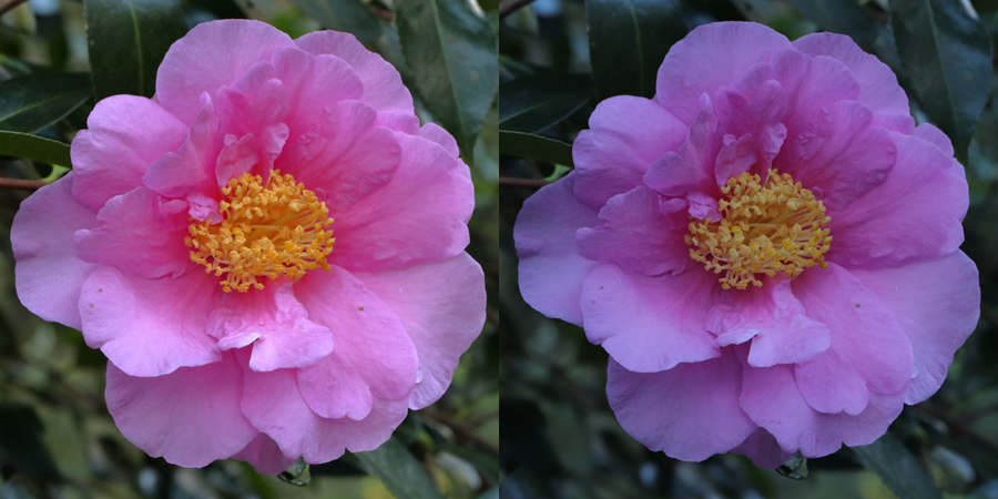This plant grows in an opening surrounded by trees. It is shaded from direct sun but the sky above is blue. My camera, set to daylight, sees it as mauve. One day I will take a picture of something white beside it and correct the white balance but most of the camellias are in similar conditions and your eyes get used to it.
