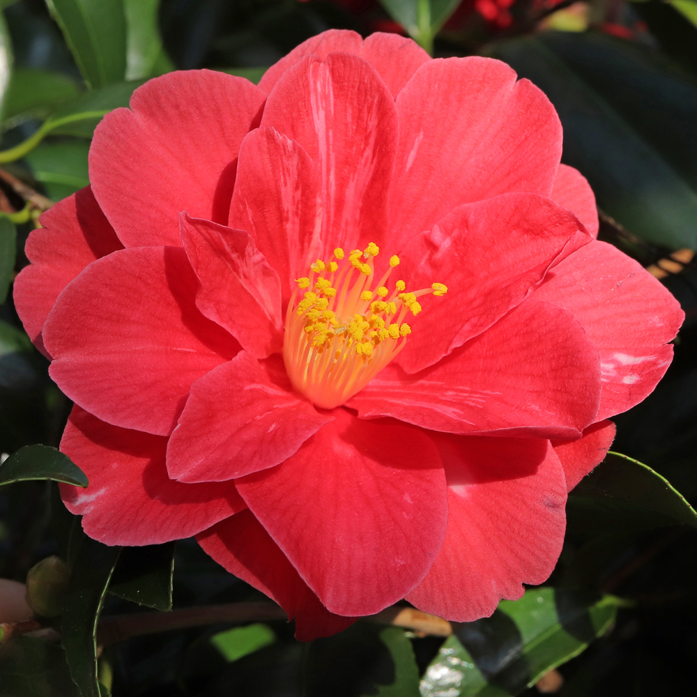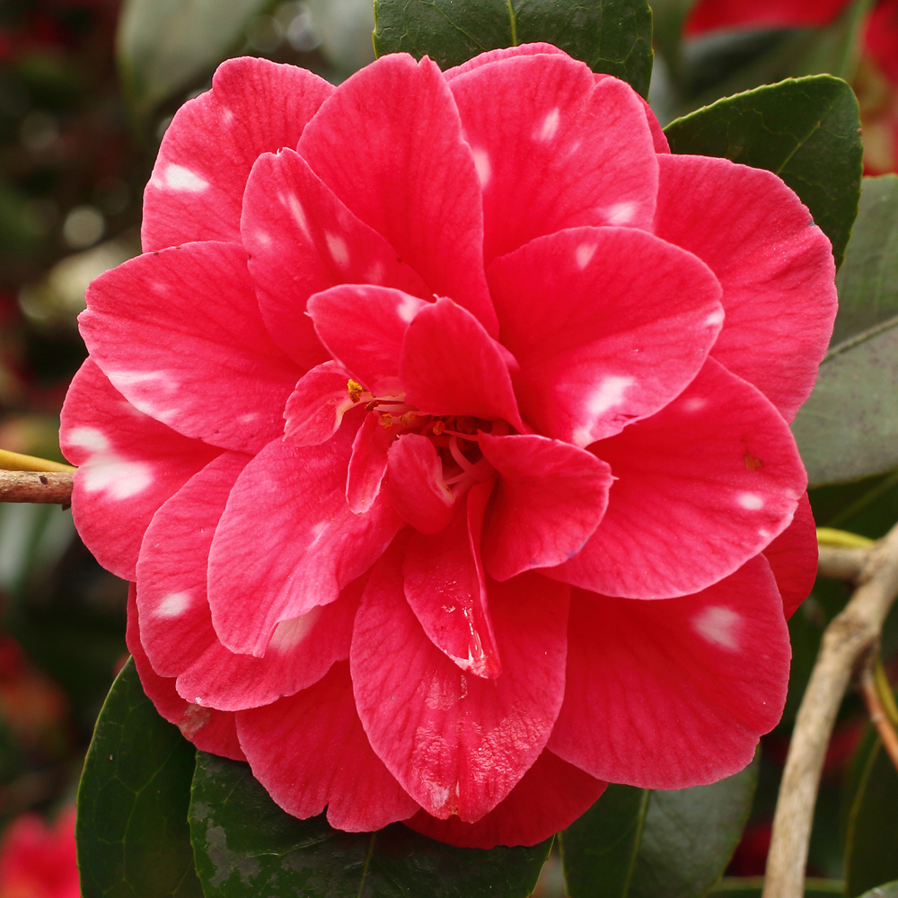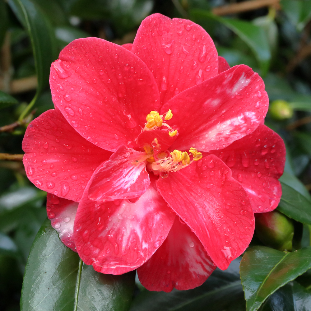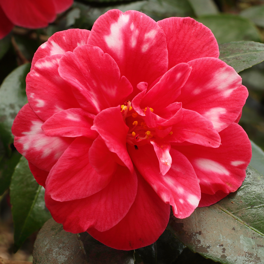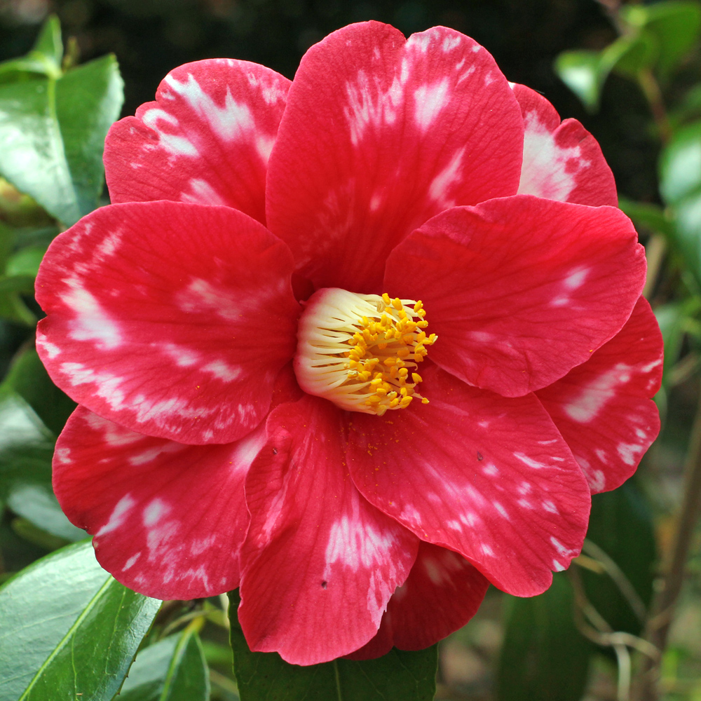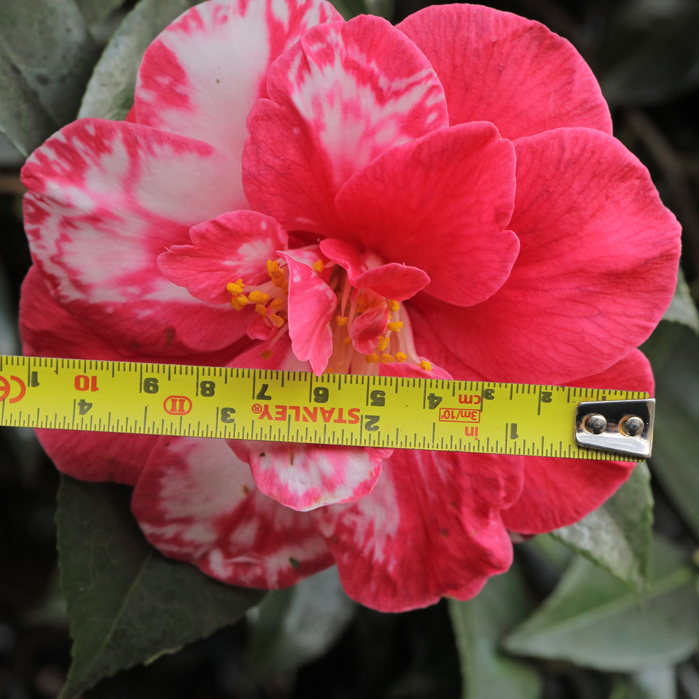 Most visitors to Mt Edgcumbe will start at the top of the collection and work their way down. This will take them along the level path known as the Earl’s Drive, along both sides of which are planted camellias. One of the most prominent of these, in section 5A, not quite at the path edge but with nothing in front of it to spoil the view, is a large bush that every year is smothered in striking red flowers blotched heavily with white. It has no label on it and I have not produced one for it because I don’t know what it is.