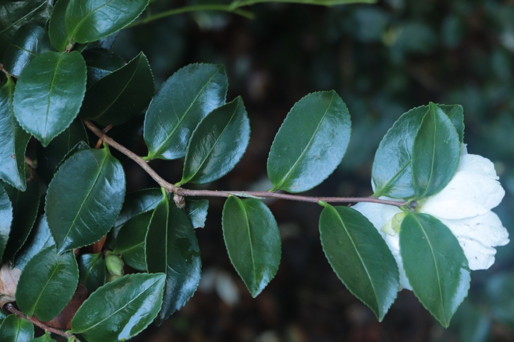 The leaves are relatively short and broad as compared to many sasanqua varieties and are often somewhat oblong, with straightish sides narrowing in abruptly to a blunt tip. In shade they are often flat either side of the midrib, turning up at the edges in a tea-plate profile. They are lustrous but not glossy, mid to dark green. In sun they seem to turn rather yellowish and curl inward, but still have the same shape when flattened out. The leaves become thicker and harder in sun. It may be that in sun the plants are often somewhat stressed and that if they were in good, moisture retentive soil with a generous, uncontested root run, they might remain looking more like the shade dwelling plants.