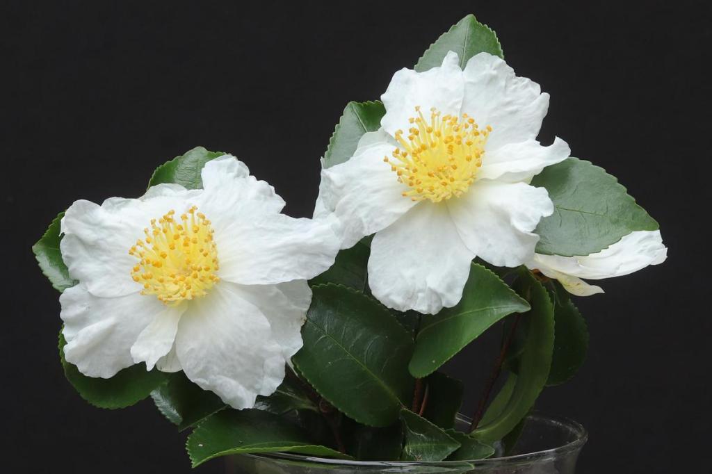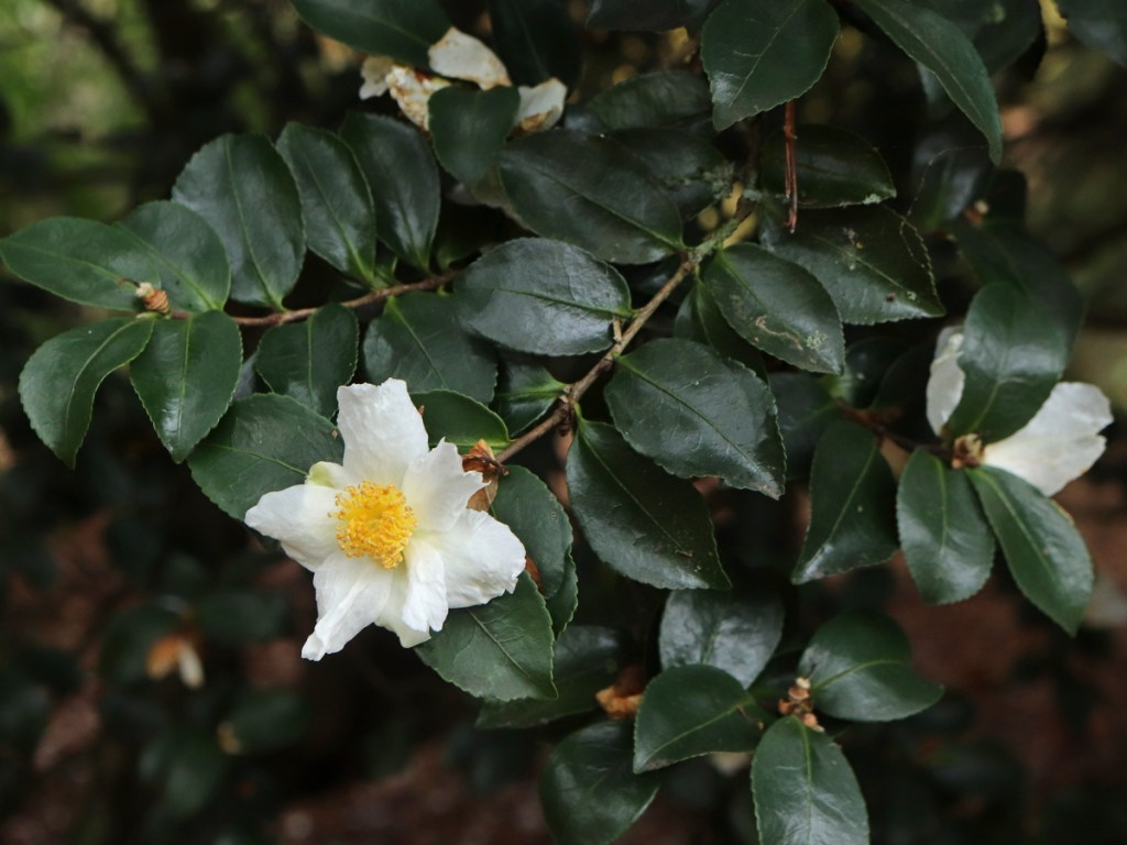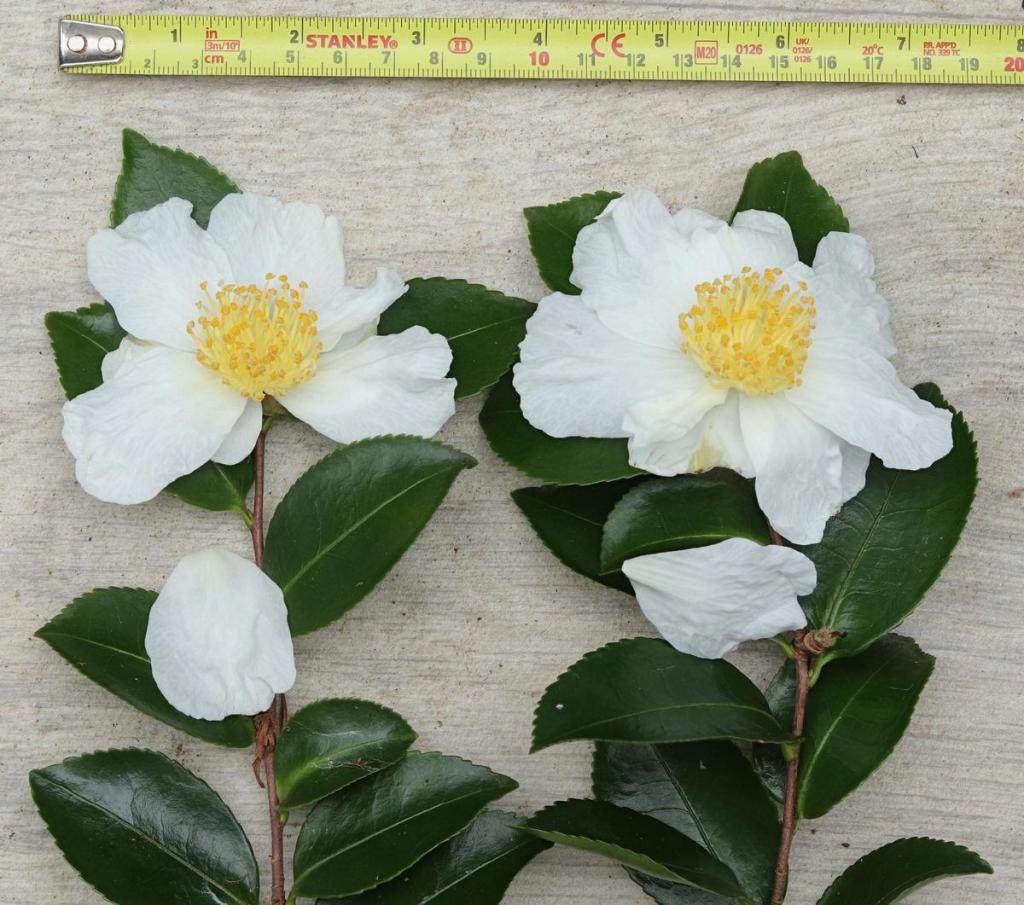 Flowers: Pure white, 8-10cm across when wide open, 7-9 petals, cupped at first then opening out flat. The odd bud, perhaps one in ten, will have a smudge of pink at the tip which remains as a pink mark at the tip of a petal when the flower is open. It appears that in full sun the flowers may remain cupped. The petals are usually to some degree creped and ruffled. Scent is typical sasanqua, musky, relatively strong. At Mount Edgcumbe it flowers in November and December, a little earlier than, but overlapping, ‘Narumigata’.