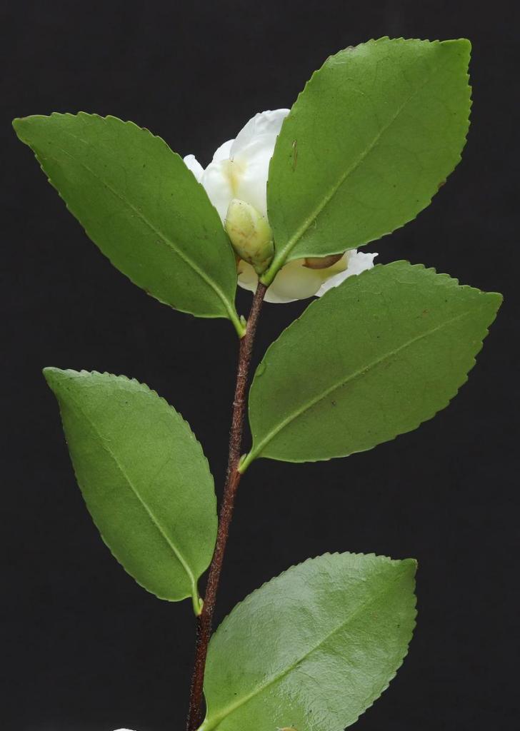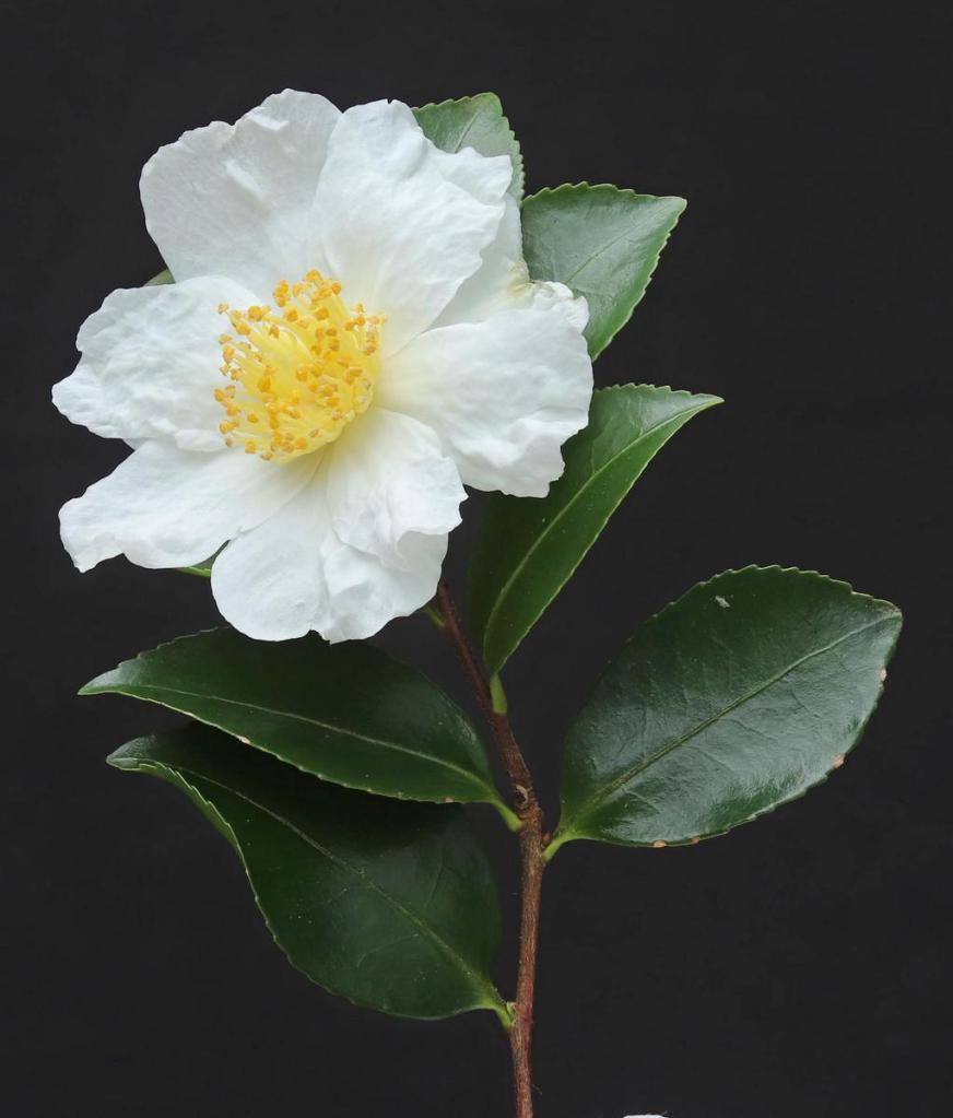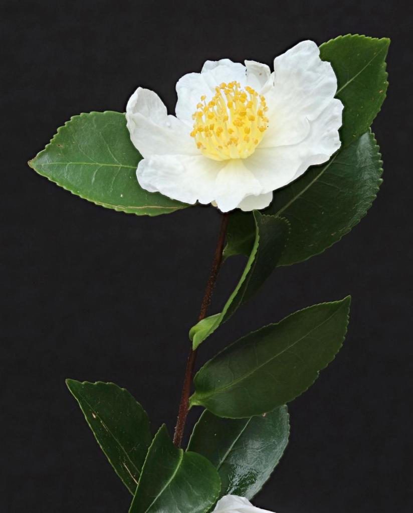 Since then, the ICS has started to populate the online version of the International Camellia Register with pictures and there is now a set for ‘Tago-no-tsuki’, taken by Sueo Takano, which again seem to be an excellent match. Subsequent correspondence with Mr Takano and the exchange of more and higher resolution images, has put the identity of this plant beyond reasonable doubt. Mr Takano showed my pictures to Mr Hakoda, president of the Japan Camellia Society, who has been studying sasanqua camellias for fifty years; he said that it was definitely ‘Tago-no-tsuki’ based on the characteristics of the flowers and leaves.