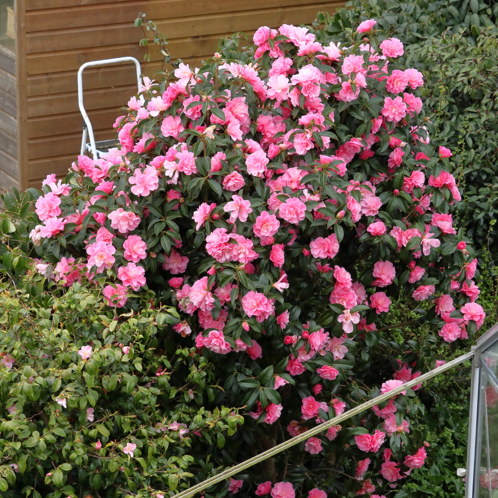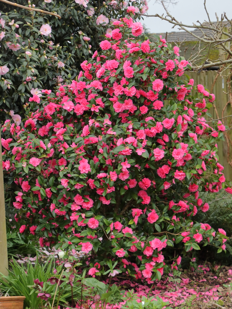 You can just see Camellia x williamsii ‘Charles Colbert’ to the right of ‘Bob Hope’. This is my biggest Camellia bush, around 3.5m tall, but with the lower branches removed to make a short trunked tree. This allows me to grow shade loving perennials beneath it while not changing its effectiveness at screening my neighbours. I keep it around this height and thin it out so that it doesn’t make too solid a block against the sky.