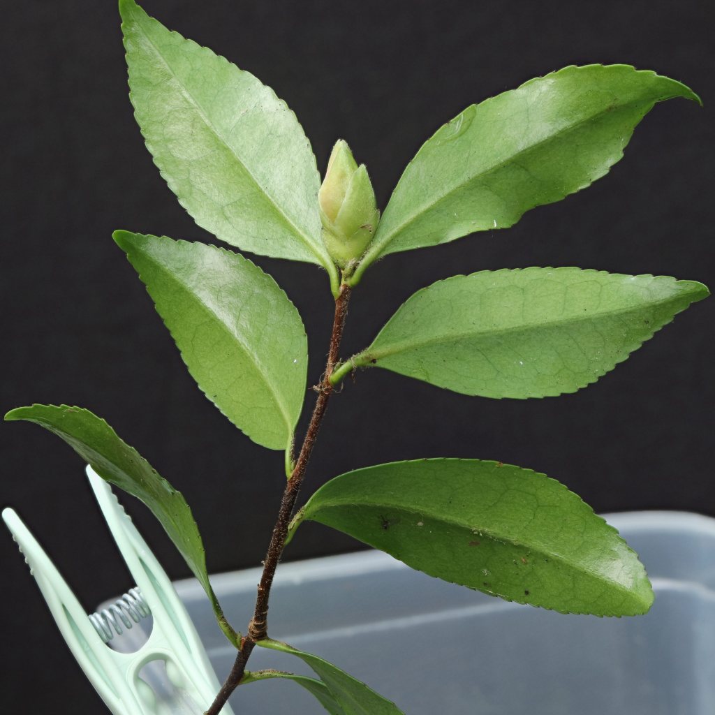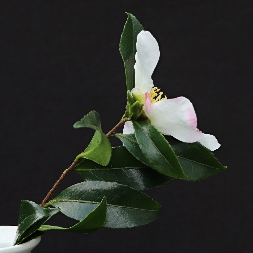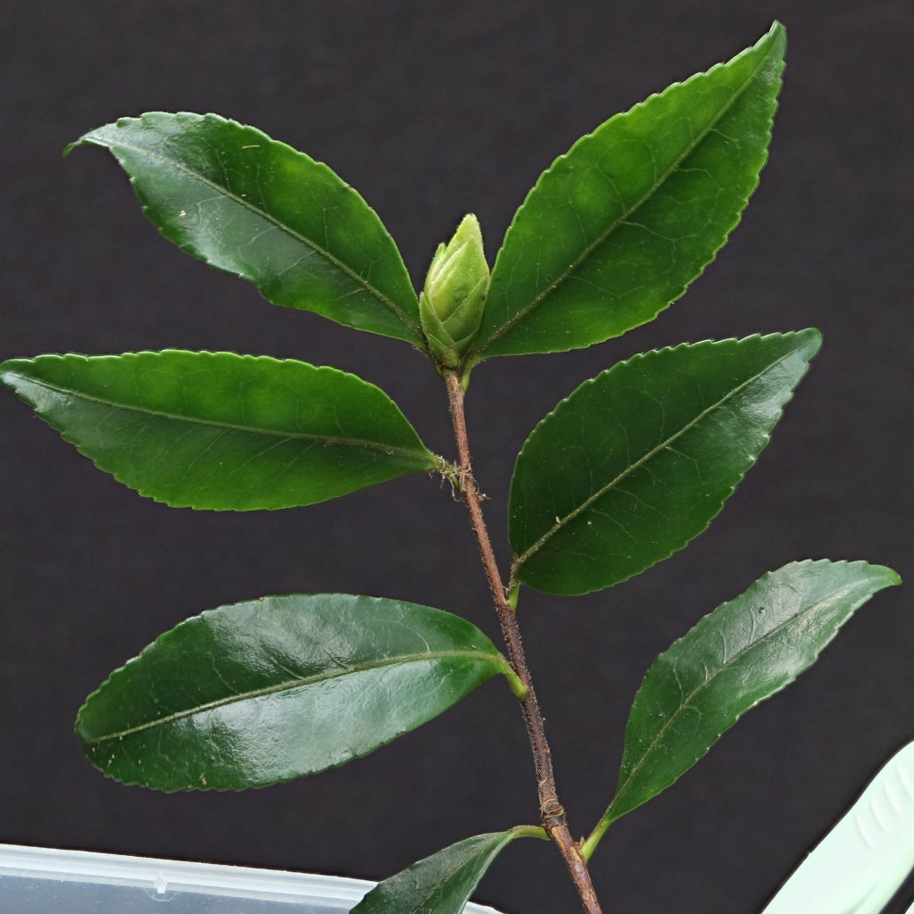 Another mystery plant in the same area is a single white sasanqua not unlike ‘Rainbow’. There are several plants of ‘Rainbow’ nearby and I have no particular reason to doubt that they are accurately named; this one, 10-078, is different. It flowers earlier, the flowers are smaller, with narrower petals and they last only a few days before shattering. It also has narrower leaves than ‘Rainbow’. I brought a few shoots home and took a series of images of it. If it looks like something you know, can you make a very careful comparison and let me know if you think you know what it is.