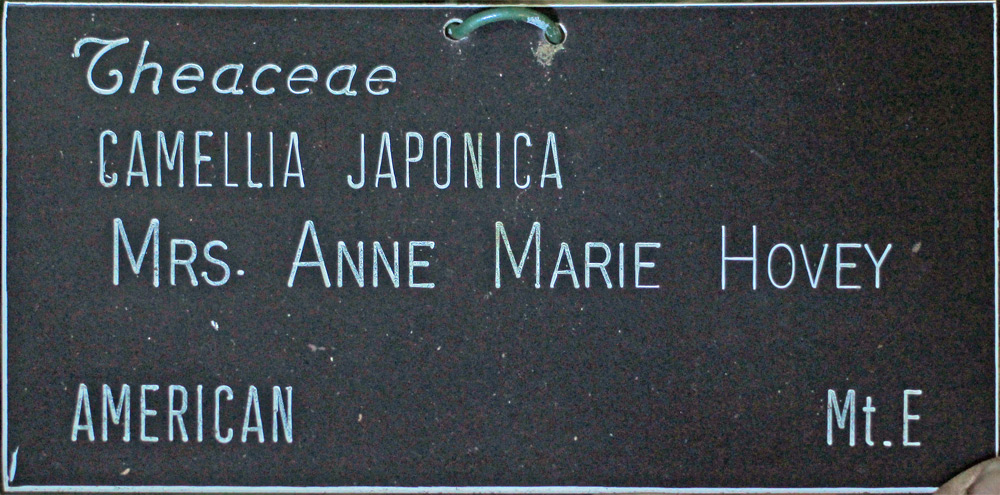 A large bush in one of the earliest planted sections, so planted in the early 1980’s, had two labels, one saying Camellia japonica ‘Mrs Anne Marie Hovey’, the other Camellia japonica ‘A M Hovey’. Elsewhere in the collection is another bush, very different in appearance, also labelled ‘Mrs Ann Marie Hovey’. In the collection records the former version was down as ‘C. M. Hovey’. ‘Mrs Anne Marie Hovey’ is noted for producing flowers in several different colours which neither of these does, so that name seemed unlikely. ‘C. M. Hovey’ seemed more credible, notwithstanding it is described as “bright crimson scarlet” and both of my specimens were at best deep pink.