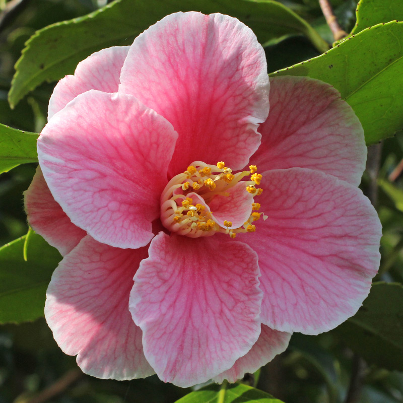 Camellia japonica ‘Robert Strauss’. Sport of ‘Cinderella’, itself a sport of ‘Fred Sander’ which is a sport of ‘Lady de Saumerez’ which is a sport of ‘Tricolor’.
