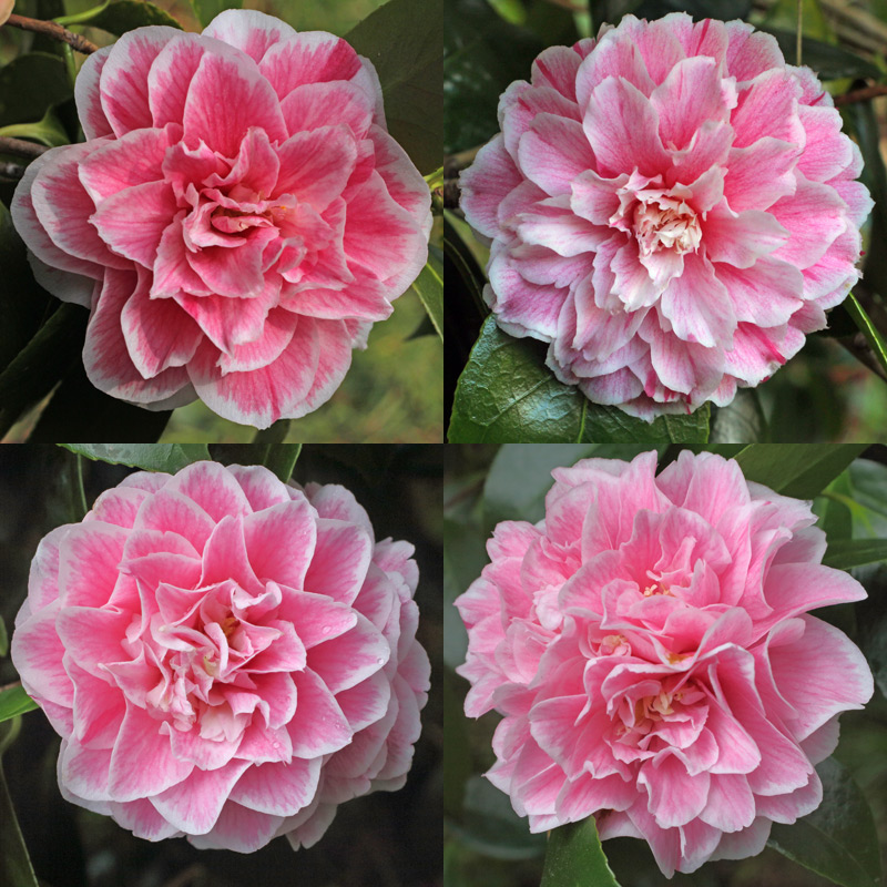 Camellia japonica ‘The Mikado’. Sport of ‘Hikarugenji’ with regular white border uncrossed by rose streaks as in its parent. On that basis, all these blooms are ‘Haikarugenji’