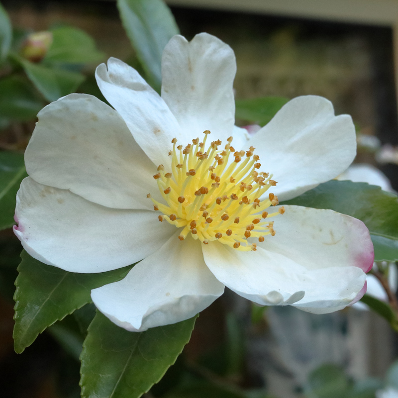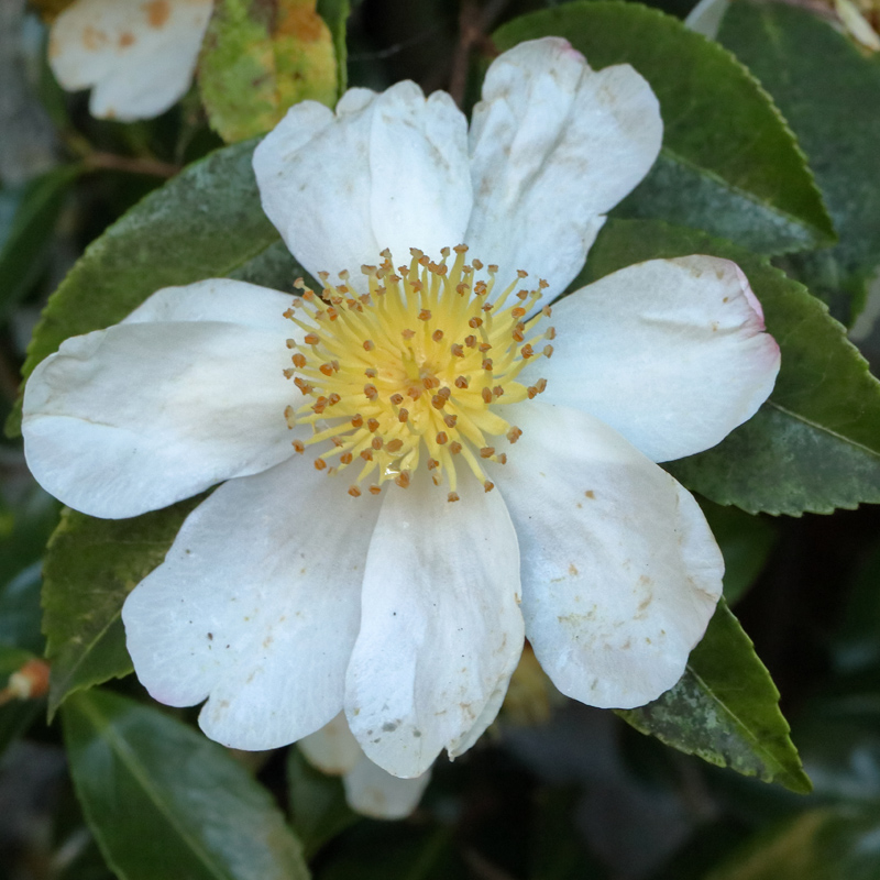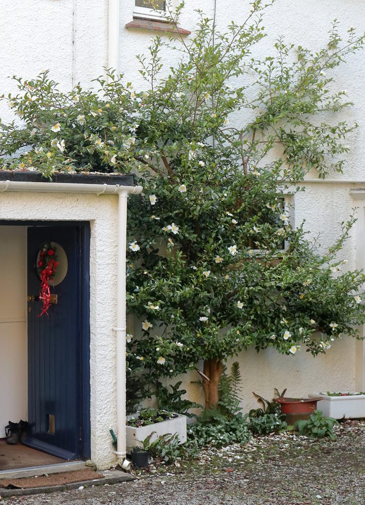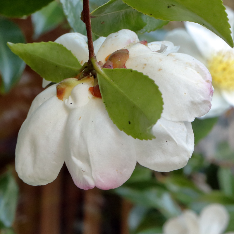 A widely available variety of the autumn flowering sasanqua type. Peak flowering in the UK is around the second half of November. The flowers are typically 9-10cm. across and cupped in shape, flattening out or slightly reflexing only on the occasional flower before the petals drop.
