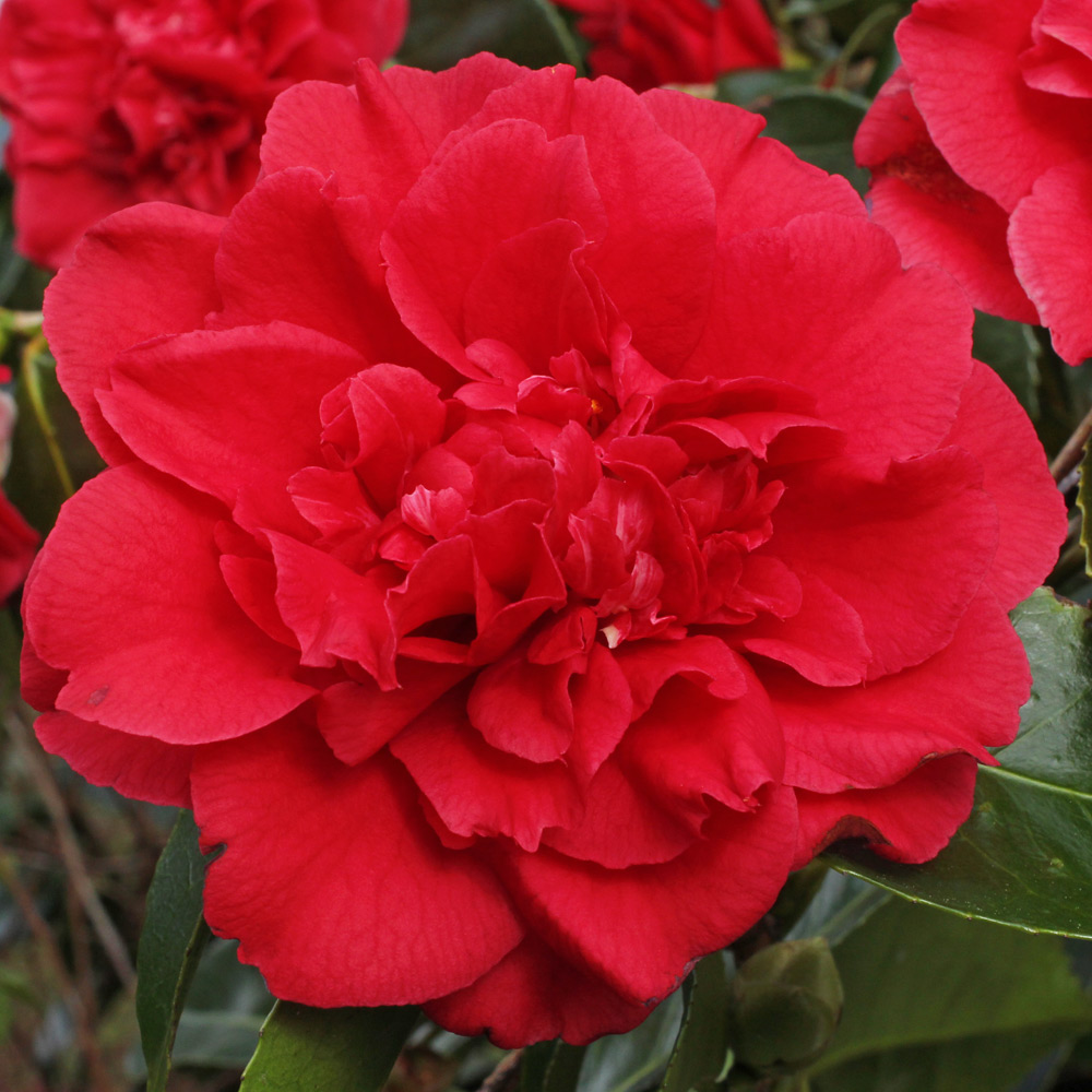 Camellia japonica ‘Grand Slam’. Part of this bush has virus variegated flowers, the rest are normal. The degree of variegation varies hugely from one season to the next.
