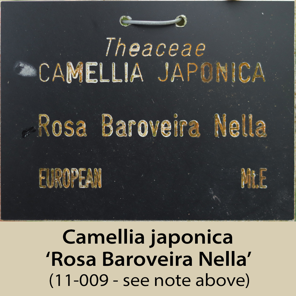 ‘Rosa Baroveira Nella’ (11-009) is not in the Camellia Register and I could find no reference to the name anywhere. In 2023 I saw a group of plants at a local garden centre with proper colour printed labels showing the same name and matching photograph. They were Dutch imported stock, so where the name comes from or whether it’s accurate is anybody’s guess.