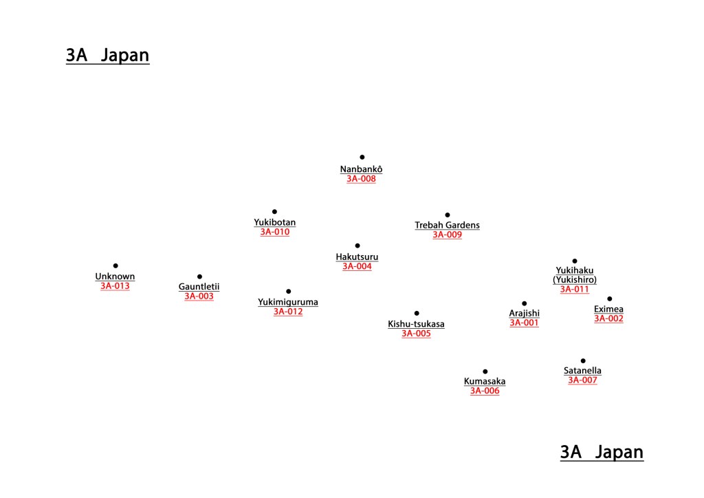 (3A-011) This was labelled ‘Yukimi haki’. It appears that the correct reading of this name is ‘Yukishiro’, meaning “Snow white”. Unfortunately it should be a pure white single. On the label it is ‘Yukimi haki’, on the plan ‘Yuki-haki’ and in the collection records ‘Yukima-Haki’. In the register ‘Yuki-haki’ is said to be a corruption of ‘Yukihaku’, itself a different reading of ‘Yukishiro’.