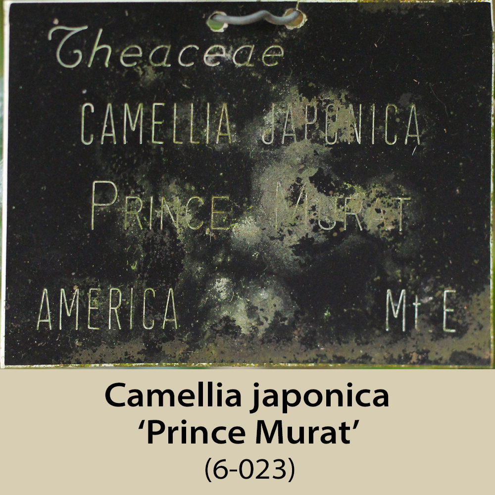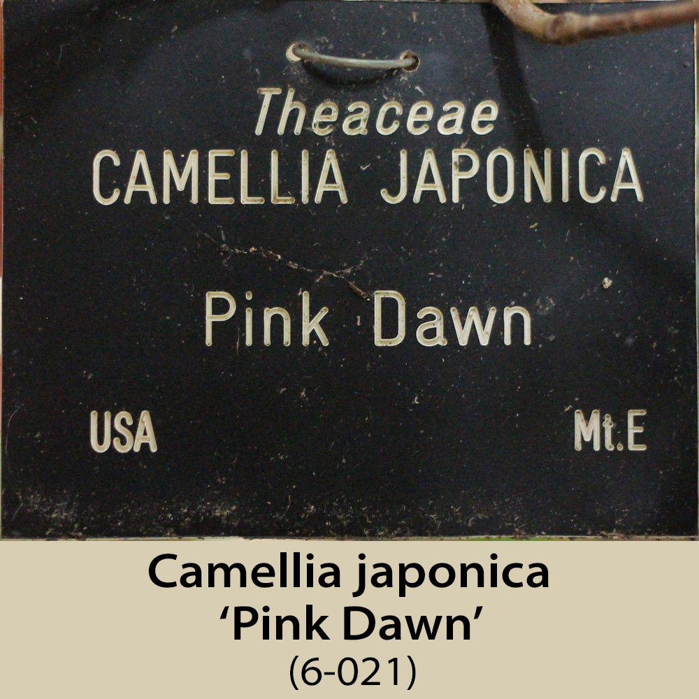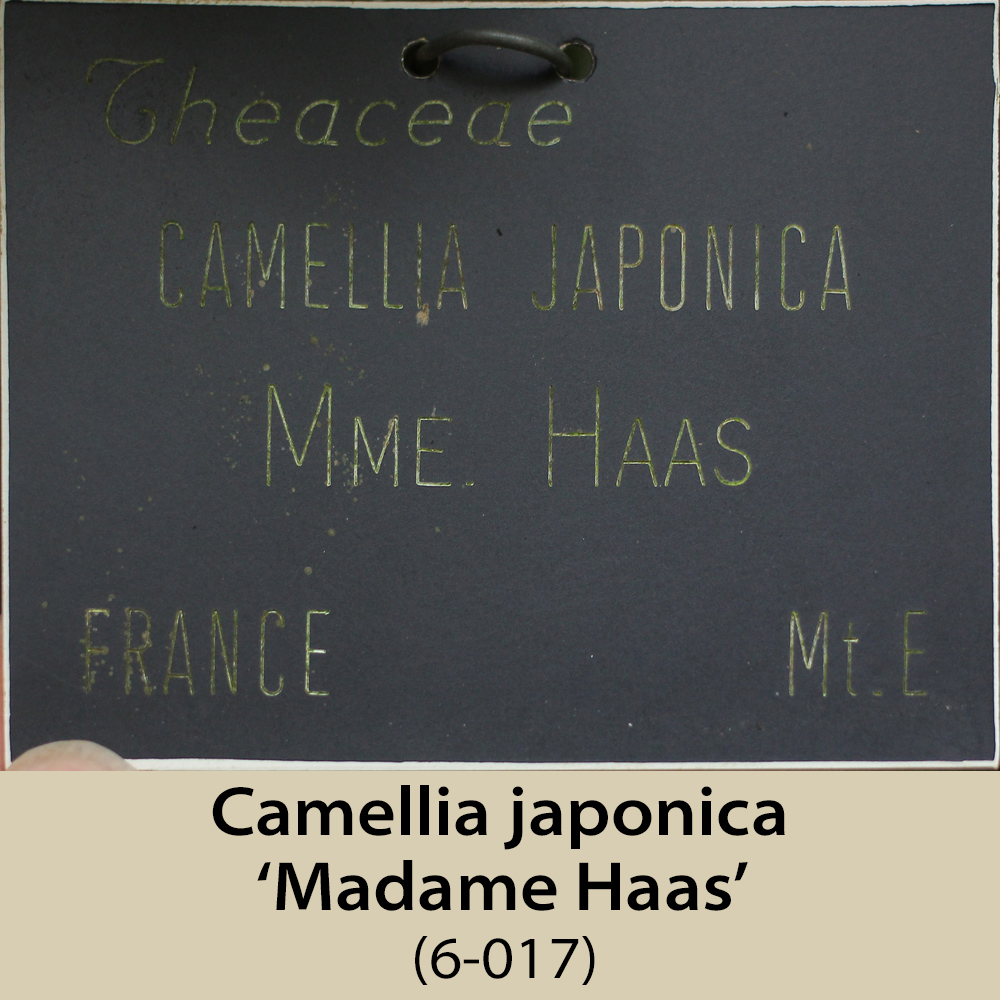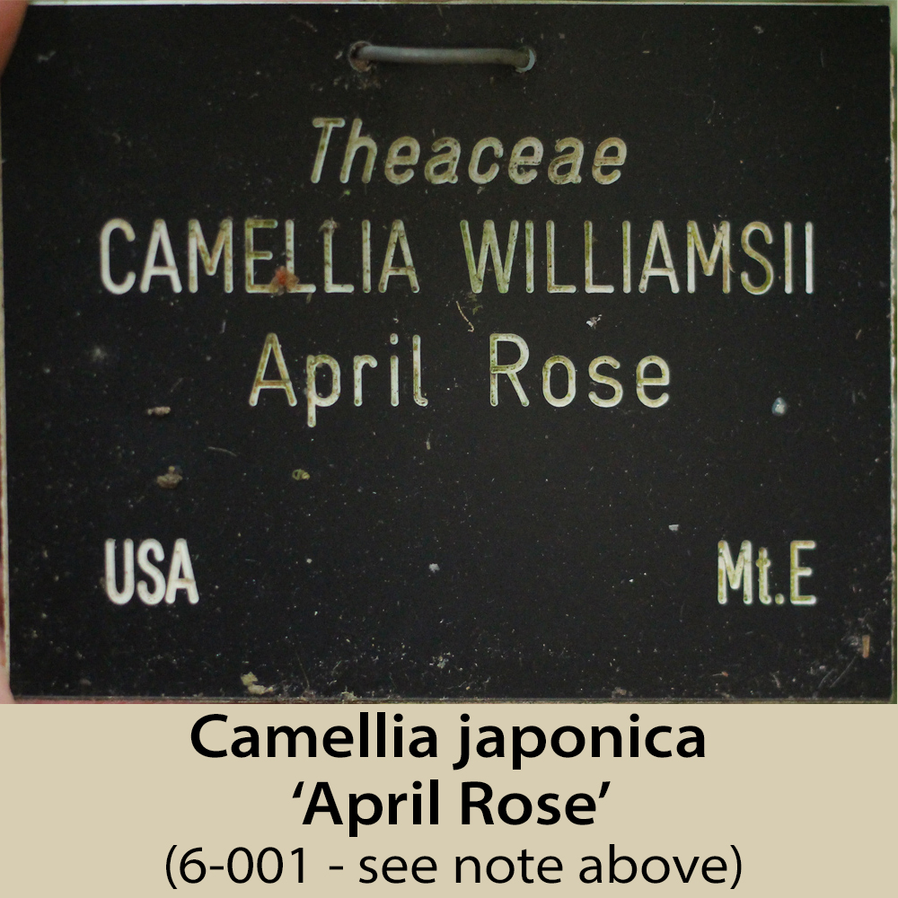 ‘Roza Harrison’/‘Sea Foam’ (6-025). The register lists a japonica ‘Sea Foam’ and a x williamsii ‘Sea Foam’. The former is an American raised formal double, the latter an English semi-double. From its leaf this looks like a japonica but the flower form is wrong for it to be ‘Sea Foam’.